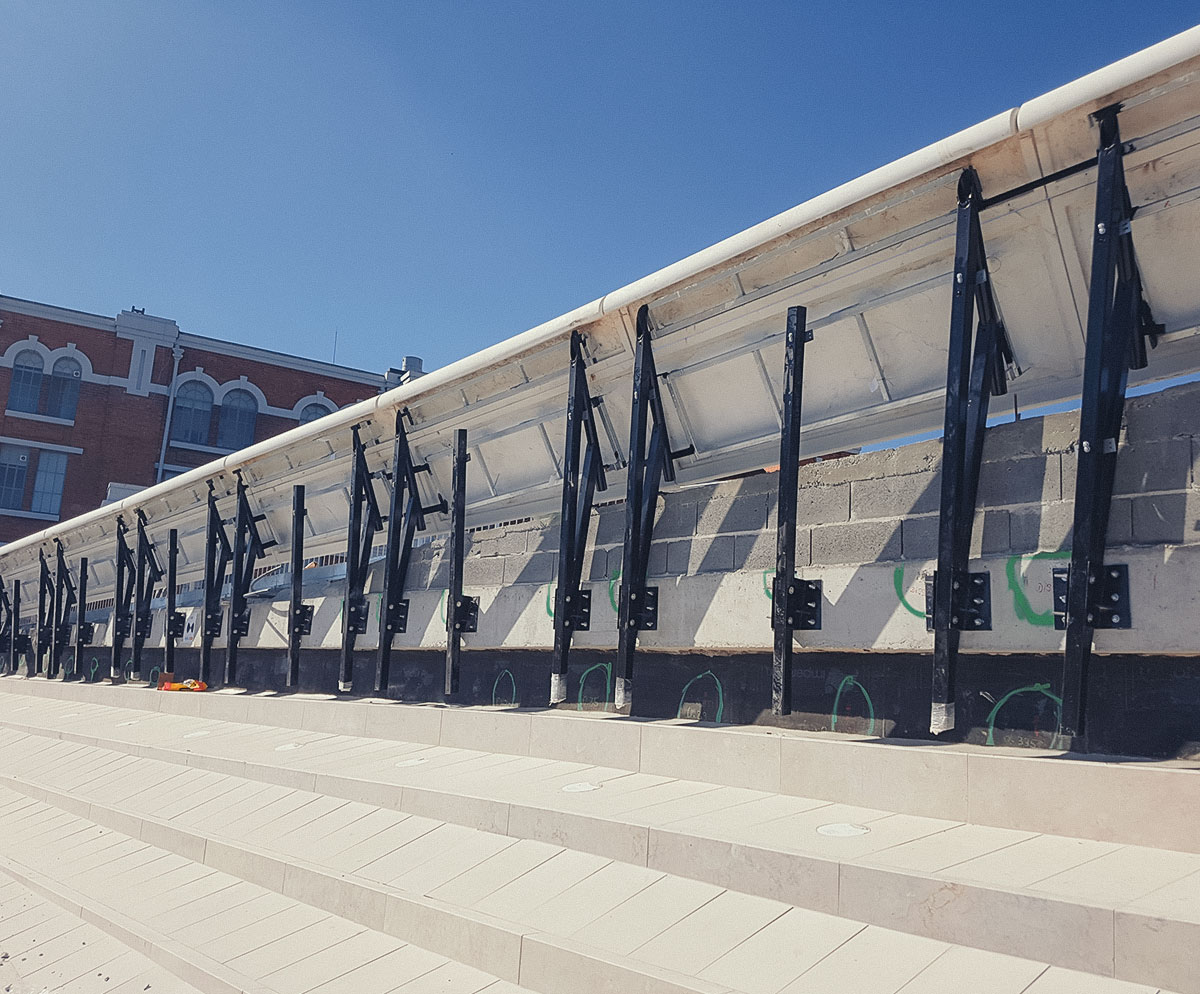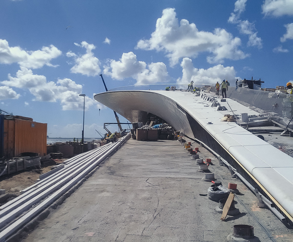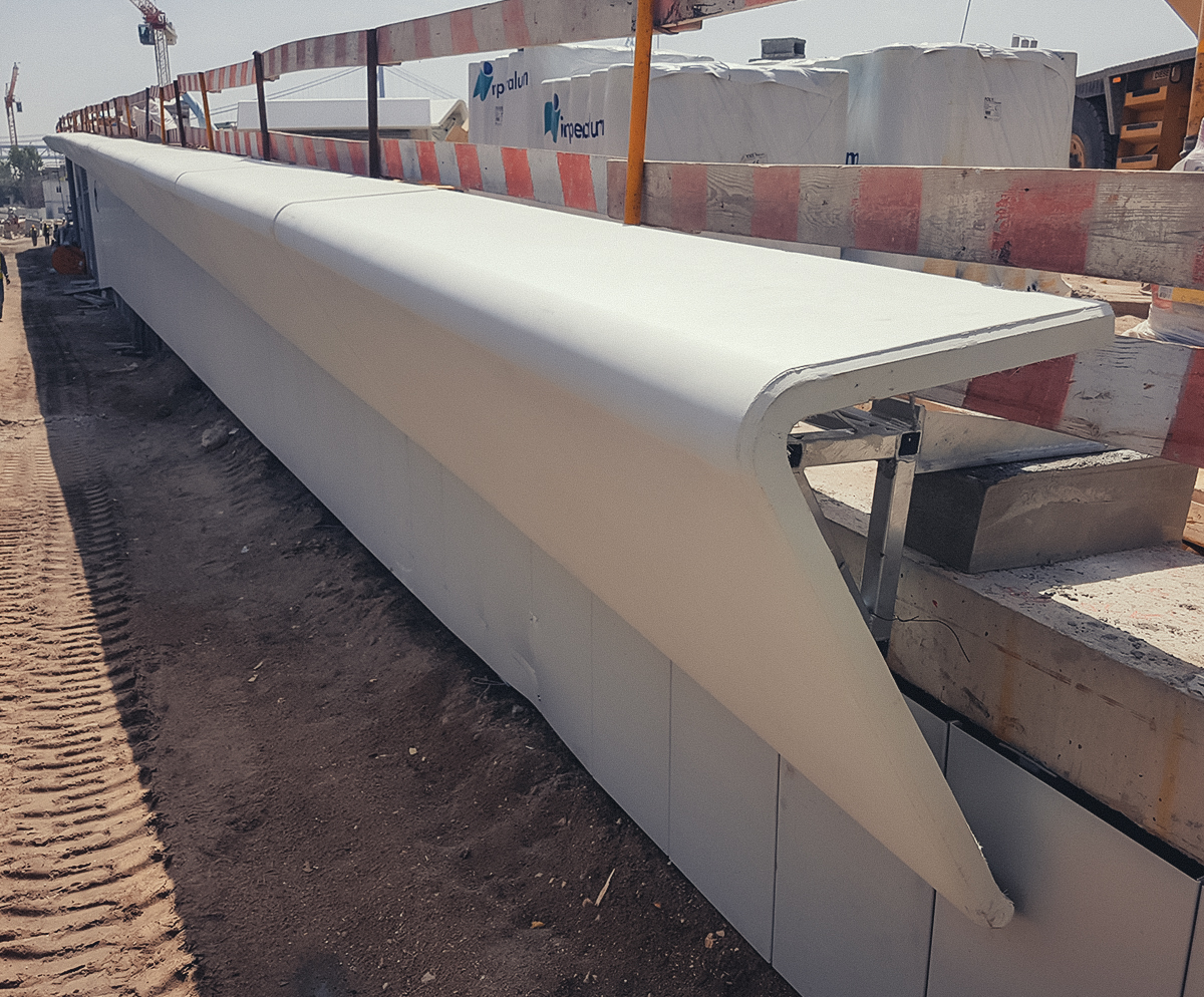Montagem de painéis de GRC na bordadura da cobertura/passagem pedonal do edifício.